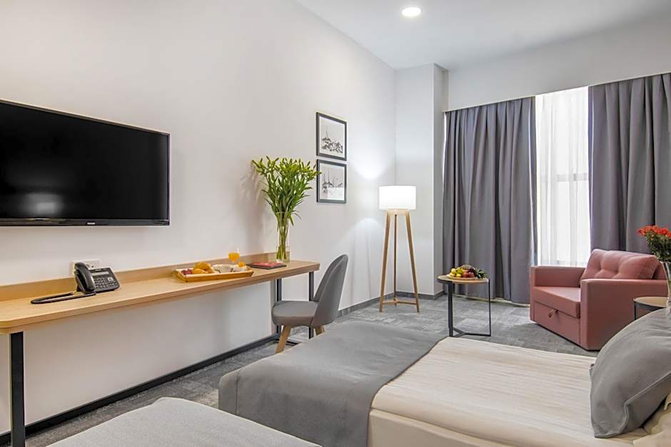 A diverse lineup of non-smoking accommodations awaits, including Studio (sleeps 2), Studio Economy (sleeps 2), Junior Suite (sleeps 2), Deluxe (Single Use) (1 adult, 1 child), Deluxe (sleeps 3 adults and 1 child), Deluxe, 2 Twin (sleeps 3 adults and 1 child) with 2 twin beds and a sofa bed, Apartment 2 Room (sleeps 2), Double Room Single Use (sleeps 1 adult and 1 child), and Double Room (sleeps 4 adults and 3 children) with a king bed and a sofa bed. All accommodations are non-smoking, providing flexible options from cozy studios to larger suites.